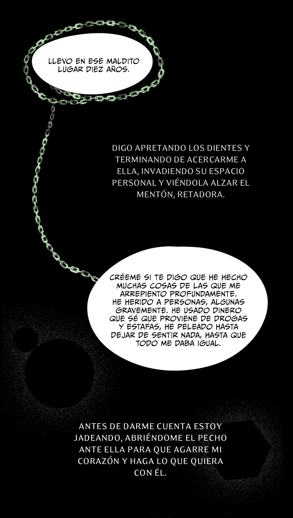 Y espero que eso sea nunca. Ella no responde, maldita sea. Apoyo las manos en mi cintura y miro al techo dando un hondísimo suspiro. No puedo disuadirla, no puedo apartarla de ese maldito lugar, solo puedo quedarme mirando mientras se destroza a sí misma.