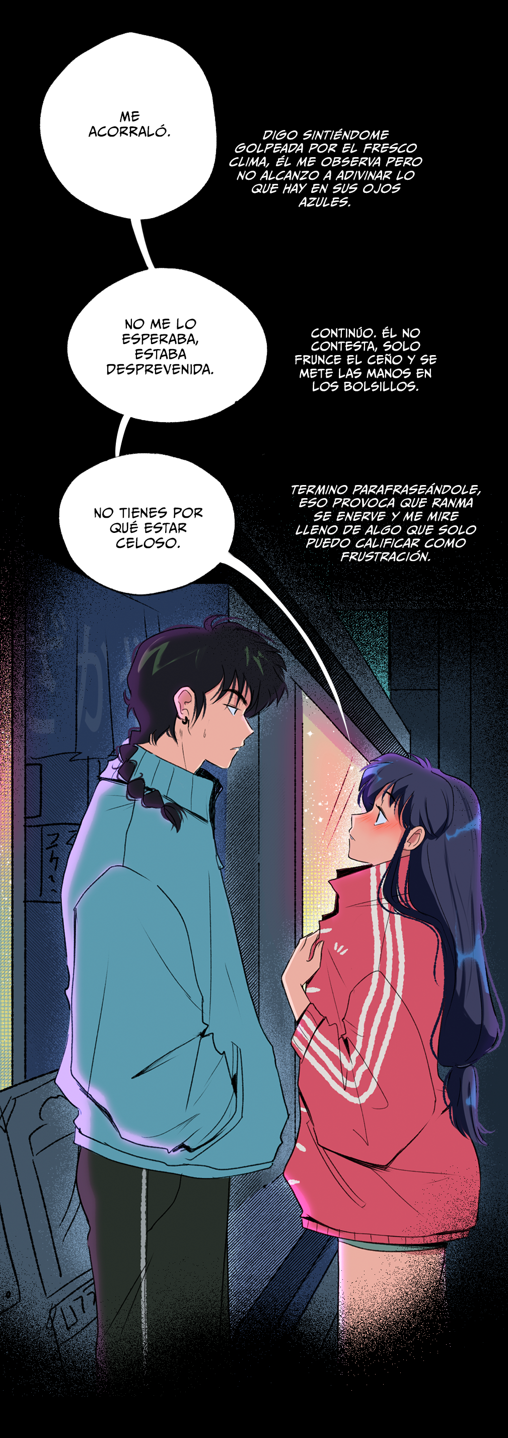 —Hoy… Hoy tengo planes —confieso esquiva, porque no quiero que forme parte de lo que tengo planeado. Voy a enfrentar a Kuno y no quiero meterlo en más líos de los que ya tiene. Ranma baja la mirada, parece contrariado, casi dolido.