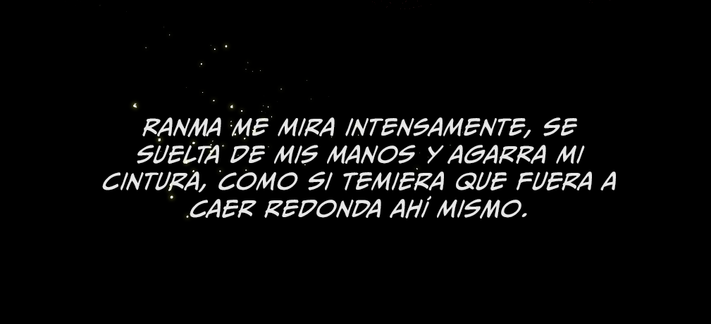 —Voy a tomar el aire —dice con voz estrangulada, yo me quedo donde estoy haciéndome paulatinamente consciente de que quizás no me he explicado bien, y poco a poco un peso horrible se apodera de todo mi ser. La ansiedad me sacude mientras me pongo en pie y voy en busca de Ranma. Me abrocho su chaqueta y salgo afuera, donde encuentro al gigantesco guerrero mirando hacia el cielo, pensativo.