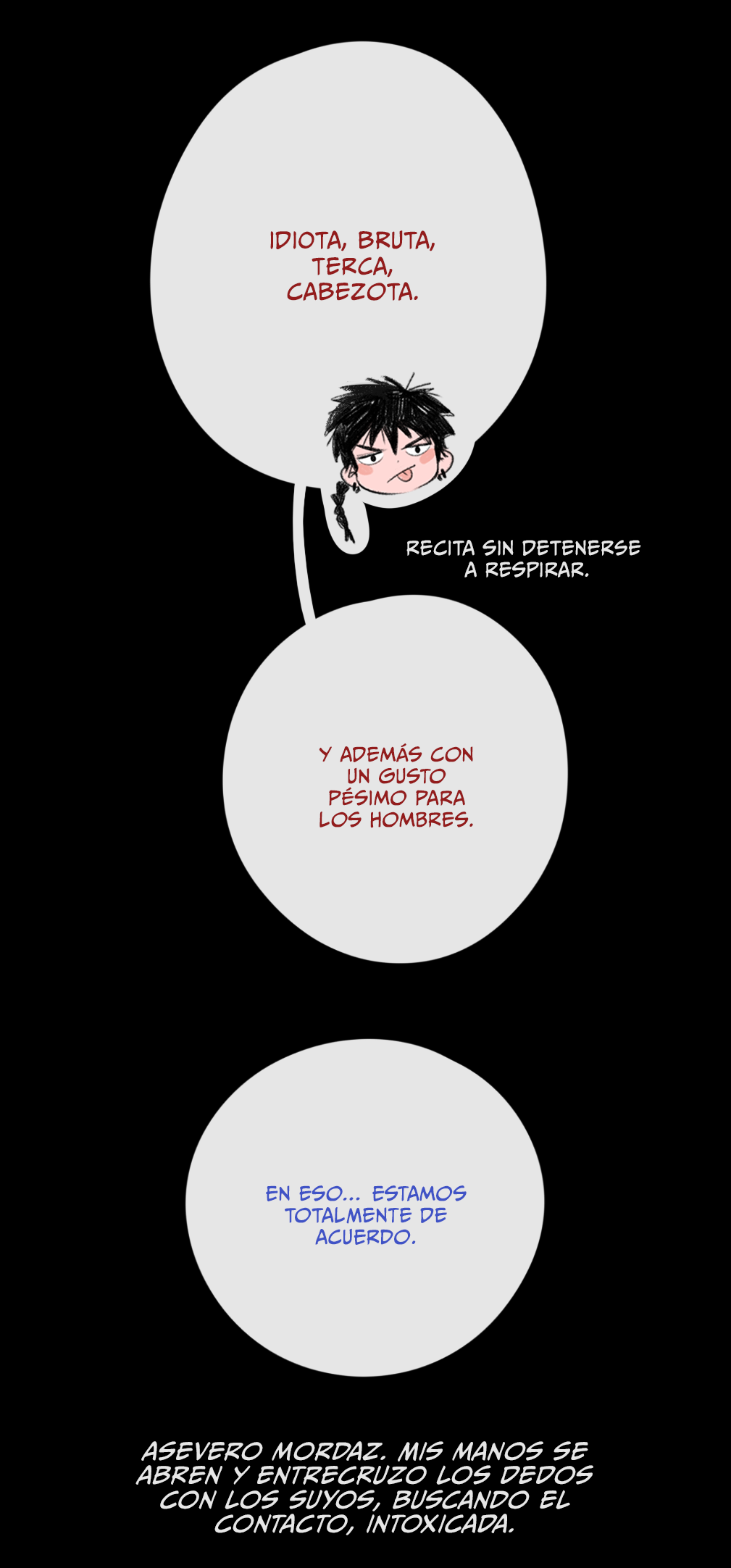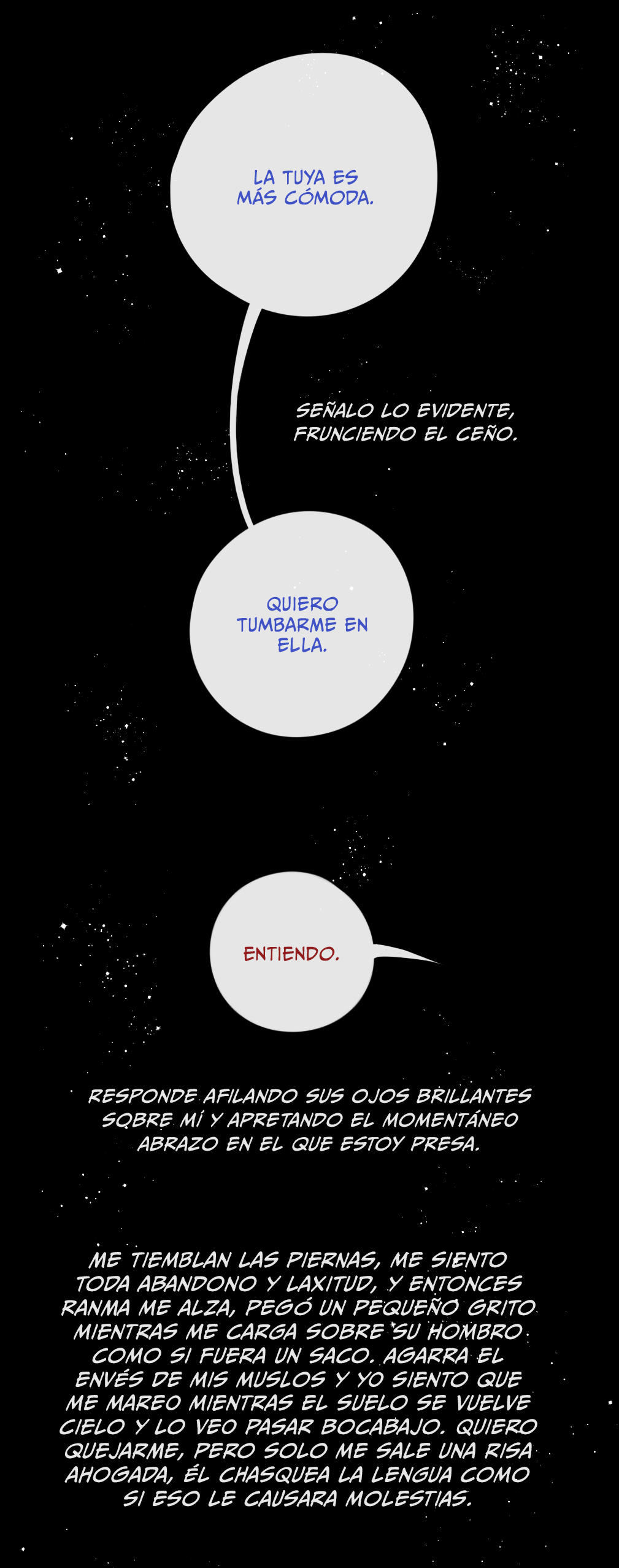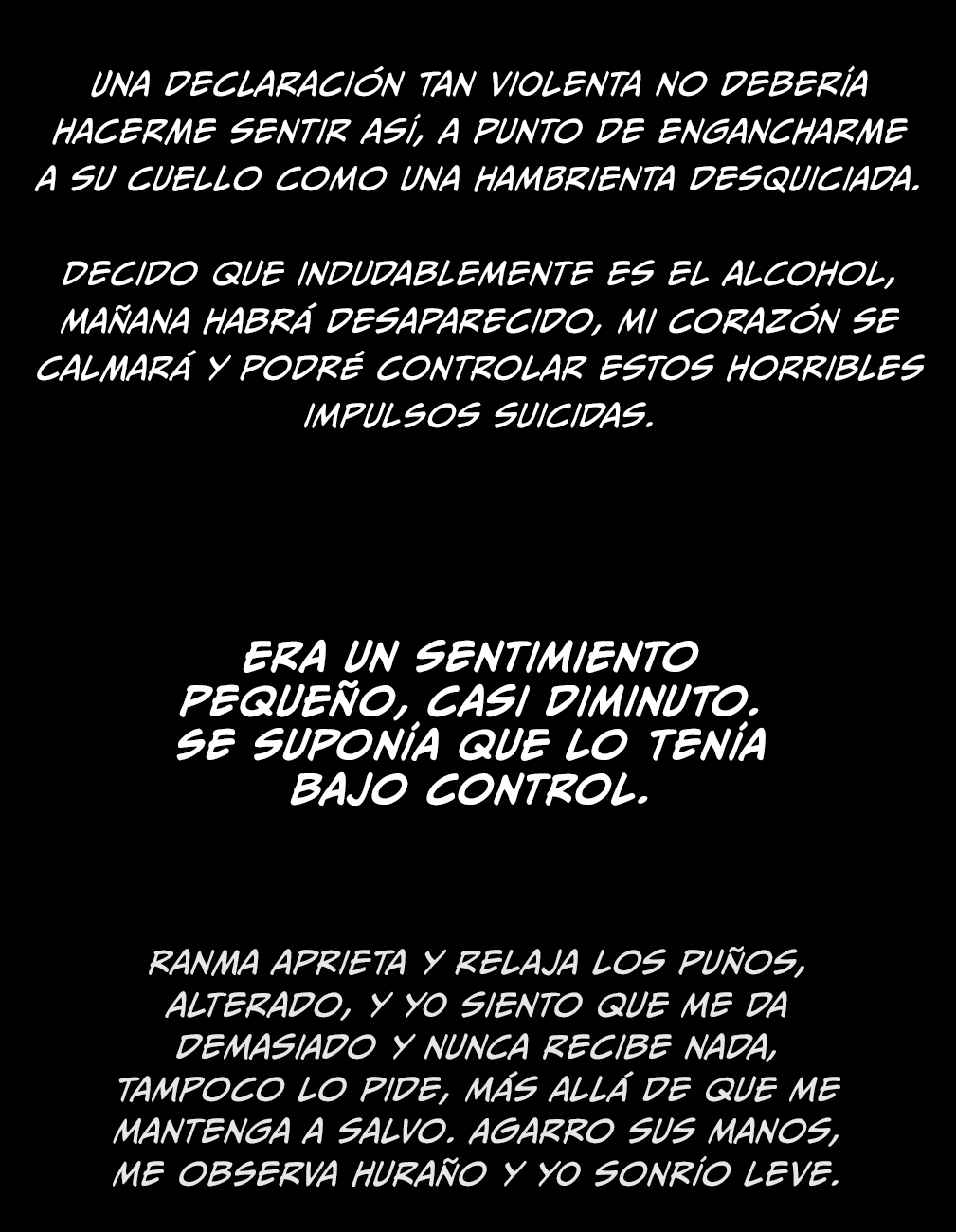 —Ummh —Ranma bebe de su cerveza y aprieta la mandíbula, está tenso como la cuerda de un arco, pero yo no puedo parar, me he tirado por una pendiente de la que solo puedo esperar terminar revolcada en millones de capas de autocompasión.