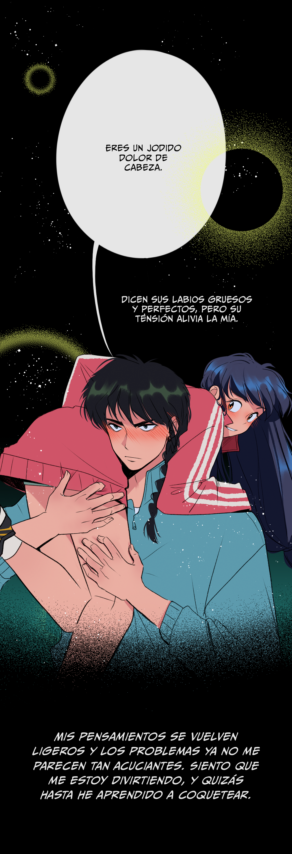 —Sí —dice Ranma, y veo sus ojos moverse nerviosos sobre mí, deteniéndose unos instantes de más en mis muslos expuestos, y eso hace que me sienta bochornosamente complacida—. Sí —repite con voz gruesa, yendo hacia el baño, yo le sigo y me quedo cerca de la puerta. Me tiende un cepillo (¿su cepillo?) y yo comienzo a luchar con la apretada trenza para deshacerla.